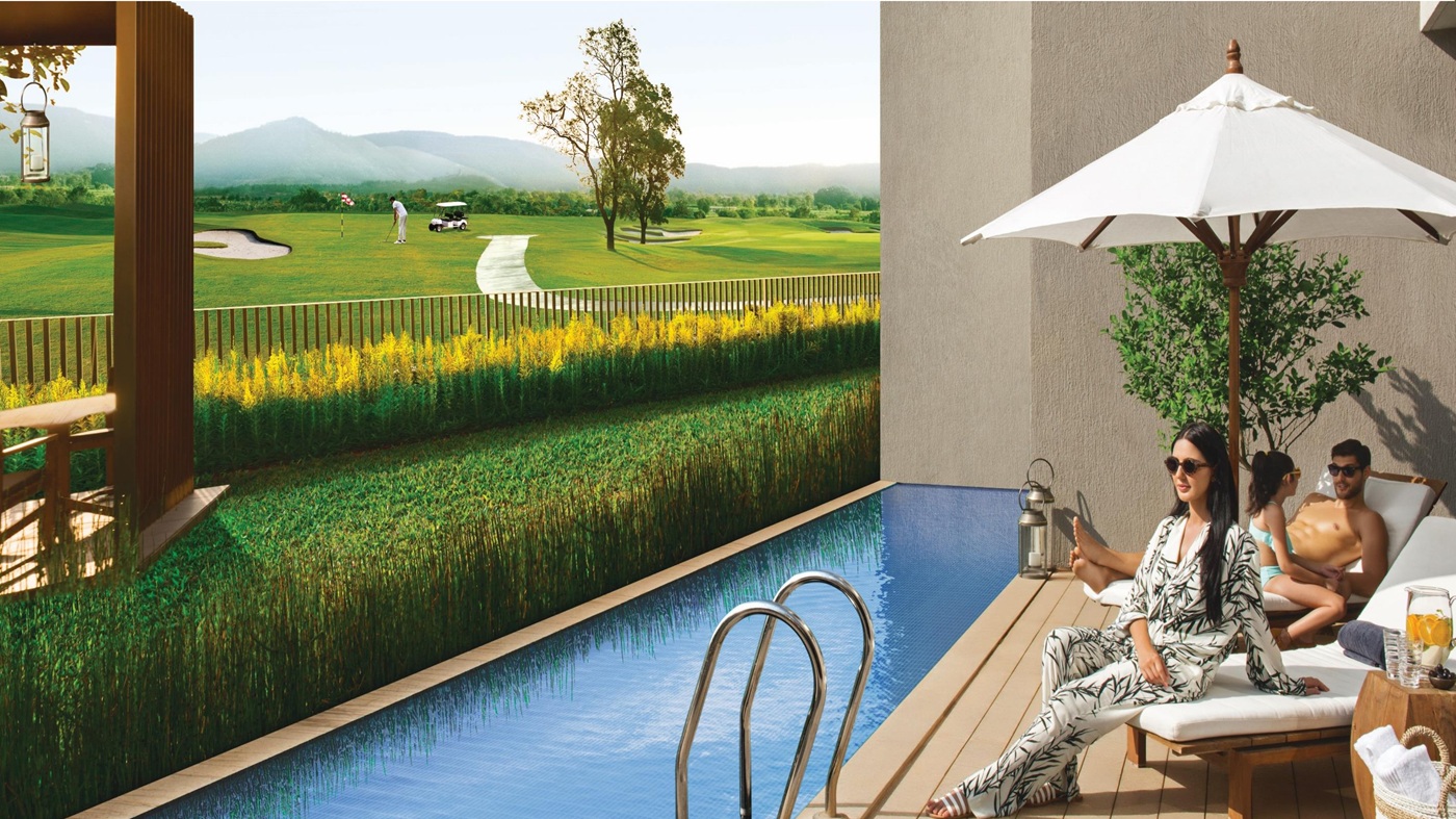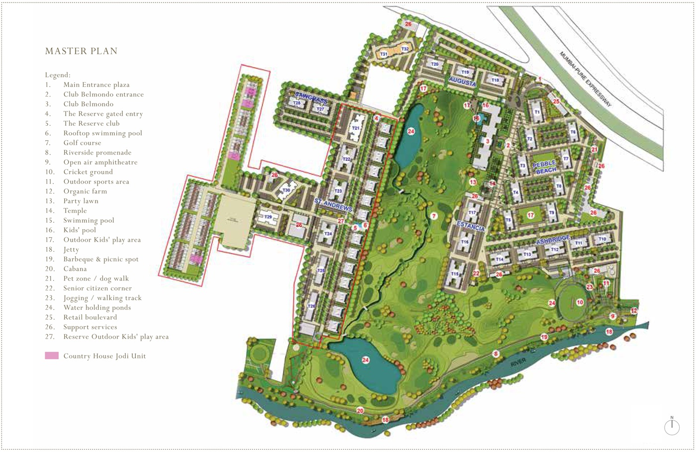 Luxury resort living: A weekend home like no other A 100+acre riverside luxury resort with 90-acres of vast open greens and a 45-acre, 9 hole golf course designed by legendary golfer Greg Norman. An extravagant 50,000 sq. ft. clubhouse, a picturesque km long riverside promenade, a gourmet restaurant and world class amenities, ensure no two weekend at Lodha Belmondo are the same.The landscape at Lodha Belmondo unfolds like a beautifully woven tapestry. The central motif is clearly the Pavana river. Following its course is a park, with leisurely walkways, quiet retreats and open-air decks, where you can contemplate the river in all its moods, catch up on your reading or even enjoy a picnic.
